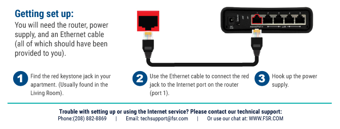 *Fiber Service only available at the Cougar Crest Apartments. Setup includes a gigabit wireless router that is installed inside the apartment. Wireless coverage from FSI provided wireless router inside the apartment is not guaranteed. Customer can run, at their own expense, ethernet cable from FSI provided wireless router to customer equipment inside apartment (i.e. switch, game console, smart TV, etc.). All equipment must be returned when service is terminated.