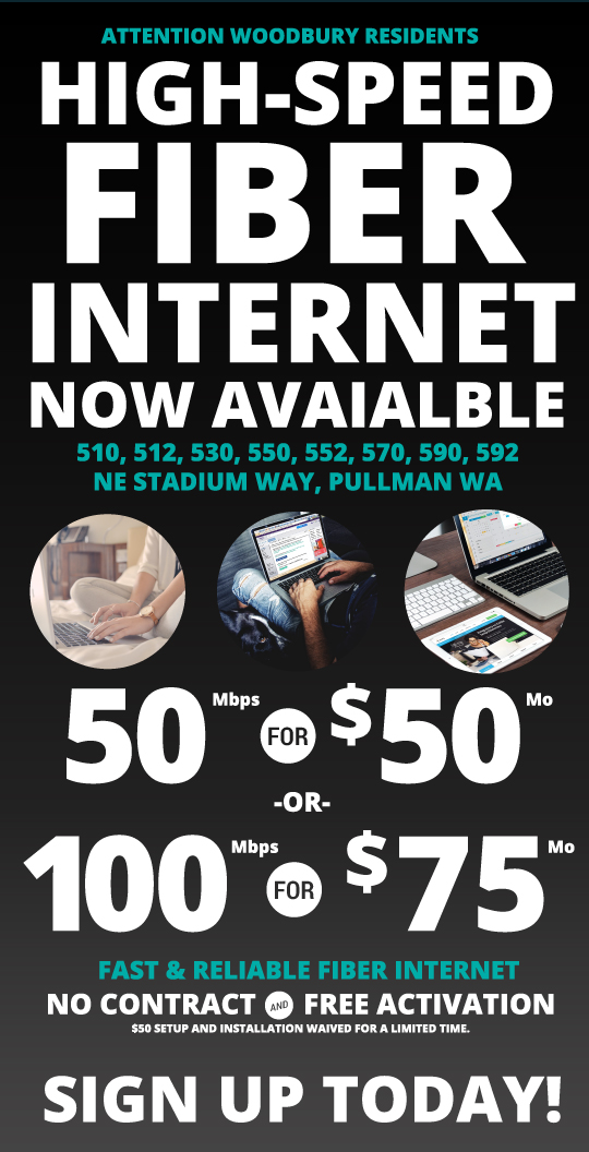 | *Service only available at the 510, 512, 530, 532, 550, 552, 570, 572, 590, 592 NE Stadium Way, Pullman WA apartments at this time. Setup includes a wireless router that is installed inside the apartment. Wireless coverage from FSI provided wireless router inside the apartment is not guaranteed. Customer can run, at their own expense, ethernet cable from FSI provided wireless router to customer equipment inside apartment (i.e. switch, game console, smart TV, etc.). All equipment must be returned when service is terminated. |