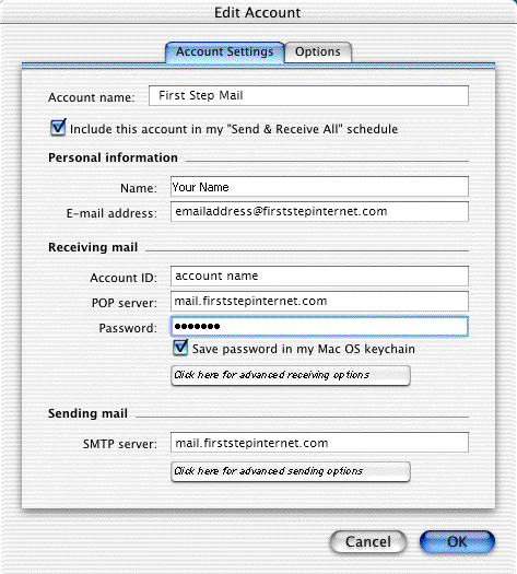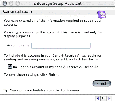 11. Type in "First Step Mail" for the account name and click the Finish button. Congratulations, this completes the initial mail setup for Entourage.
