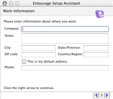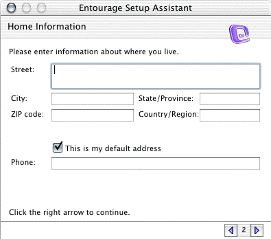03. You may enter personal information here if you like. This will help customize Entourage. When finished, click the Right Arrow button.