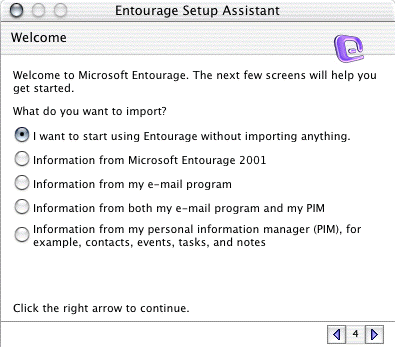 05. Choose to start using Entourage without importing anything and click the Right Arrow button.