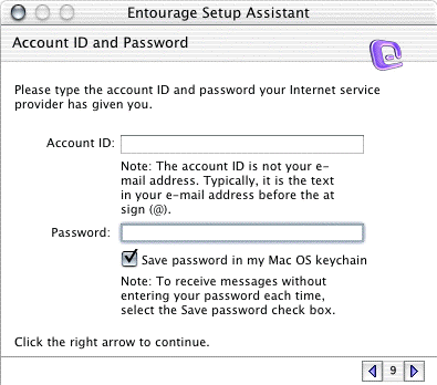 10. Your Account ID is the first part of your email address -- everything before the @ symbol. Type that in the box and then type your password in the Password box. Put a checkmark in "Save password in my Mac OS keychain" if you would like Entourage to remember your password. Click the Right Arrow button when finished.