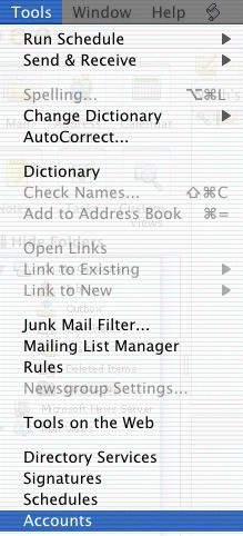 01. If you need to change a setting in your Entourage mail program after the initial setup, please Open Entourage then click the Tools menu up at the top and then Accounts. It will look like this: