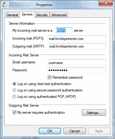 In your Properties window choose the “Servers” tab and make sure that the box next to “My server requires authentication” is checked. Once it is check click the “Settings…” button next to it and make sure that “Use the same settings as my incoming mail server” is selected. Then click “Apply” and then “OK” to close that window. Then, back in your Properties window select the “Advanced” tab.