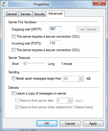Under the Advanced tab, make sure your “Outgoing mail (SMTP)” is set to 587.
