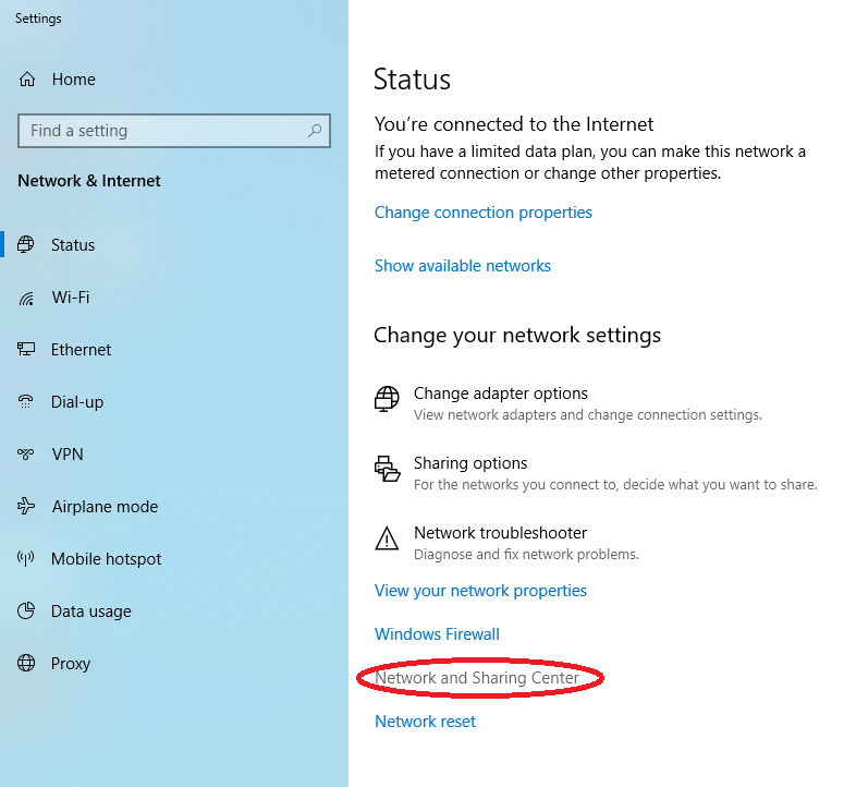 02. On the Network & Internet - Status page, click on the "Network and Sharing Center" link.