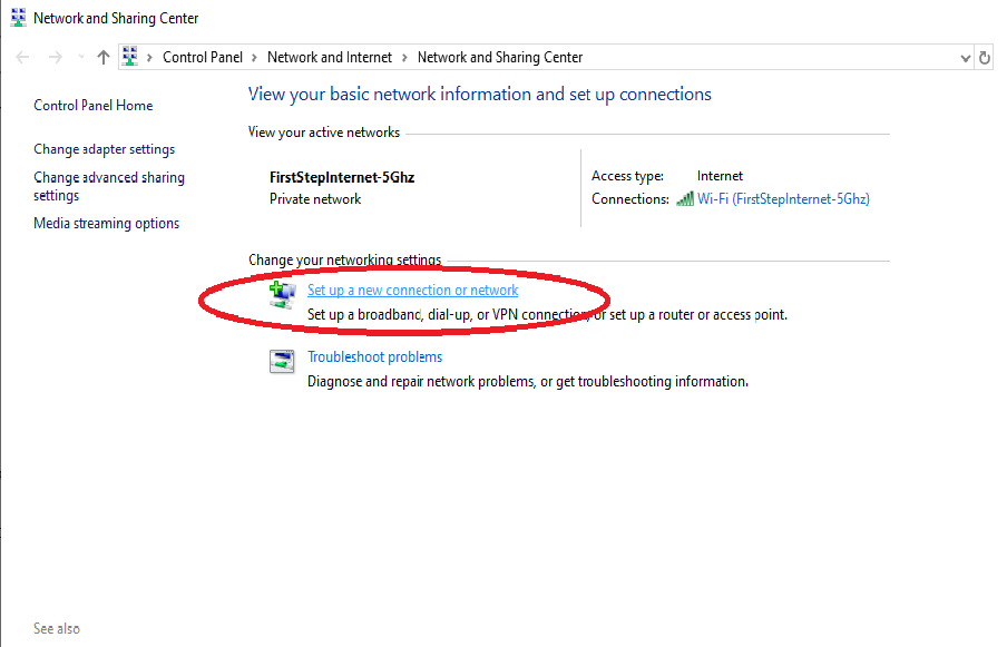 03. In the Network and Sharing Center window, click on "Set up a new connection or network". It is located under the "Change your networking settings" header.