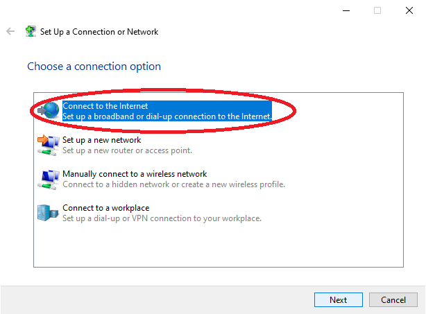 04. In the "Set Up a Connection or Network" dialog, select "Connect to the Internet, Set up a broadband or dial-up connection to the Internet" and press the "Next" button.