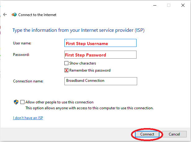 06. Enter your First Step username and password, check the box for "Remember this password", and change the connection name to something you'll recognize, such as "First Step PPPoE". Once those fields are filled out, click the "Connect" button.