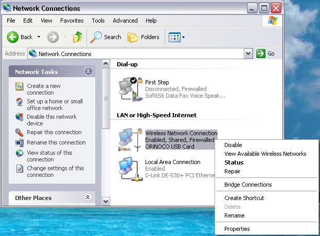 Inside the Network Connections, right-click the Wireless Network Connection icon and choose Properties from the list.